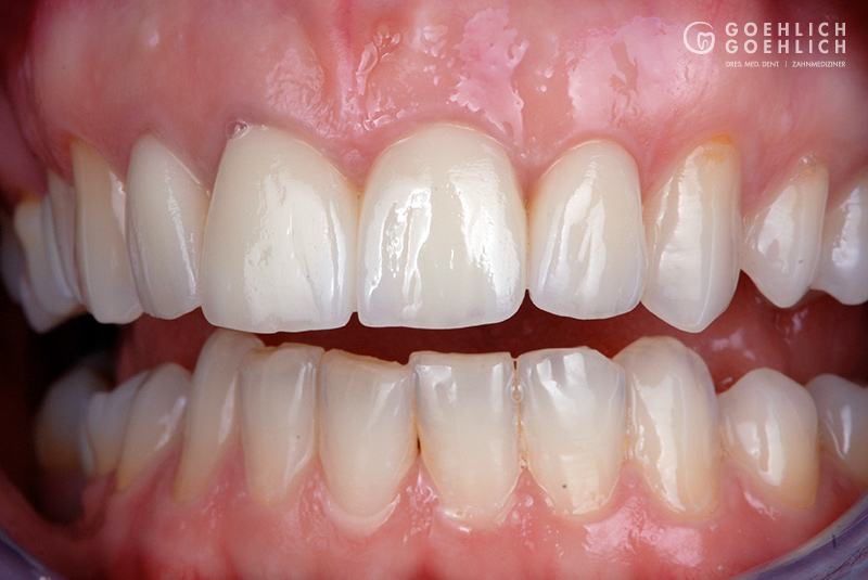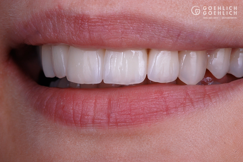 Zwei vollkeramische Frontzahnkronen (mittlere Schneidezähne) und zwei Veneers auf seitlichen Schneidezähnen